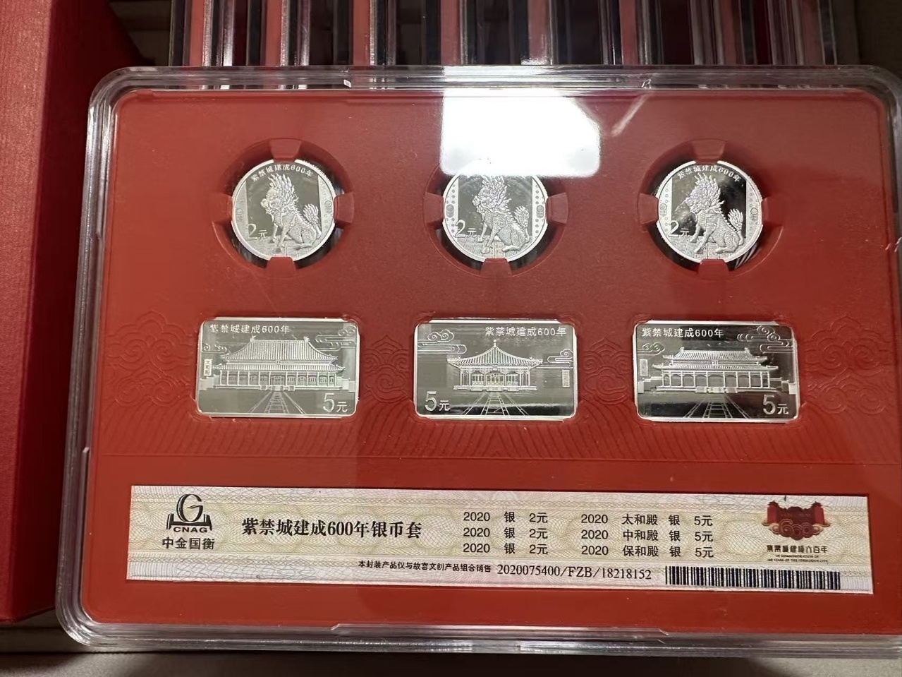 • 商品描述:《紫禁和美套装》封装纪念版采用封装纪念形式,包含2020年中国人民银行发行的紫禁城建成600年5克圆形银质纪念币3枚*50(连号),纪念币背面主图为麒麟;紫禁城建成600年15克长方形银质纪念币3枚*50(连号),纪念币背面主图分别为太和殿、中和殿、保和殿;将纪念币藏于中和殿之中,同贺紫禁城600年,传递紫禁祥瑞。