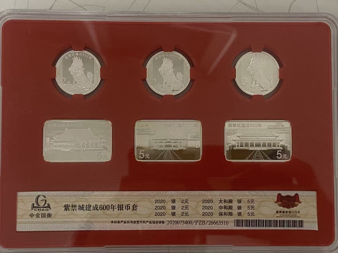 • 商品描述:《紫禁和美套装》封装纪念版采用封装纪念形式,包含2020年中国人民银行发行的紫禁城建成600年5克圆形银质纪念币3枚*50(连号),纪念币背面主图为麒麟;紫禁城建成600年15克长方形银质纪念币3枚*50(连号),纪念币背面主图分别为太和殿、中和殿、保和殿;将纪念币藏于中和殿之中,同贺紫禁城600年,传递紫禁祥瑞。