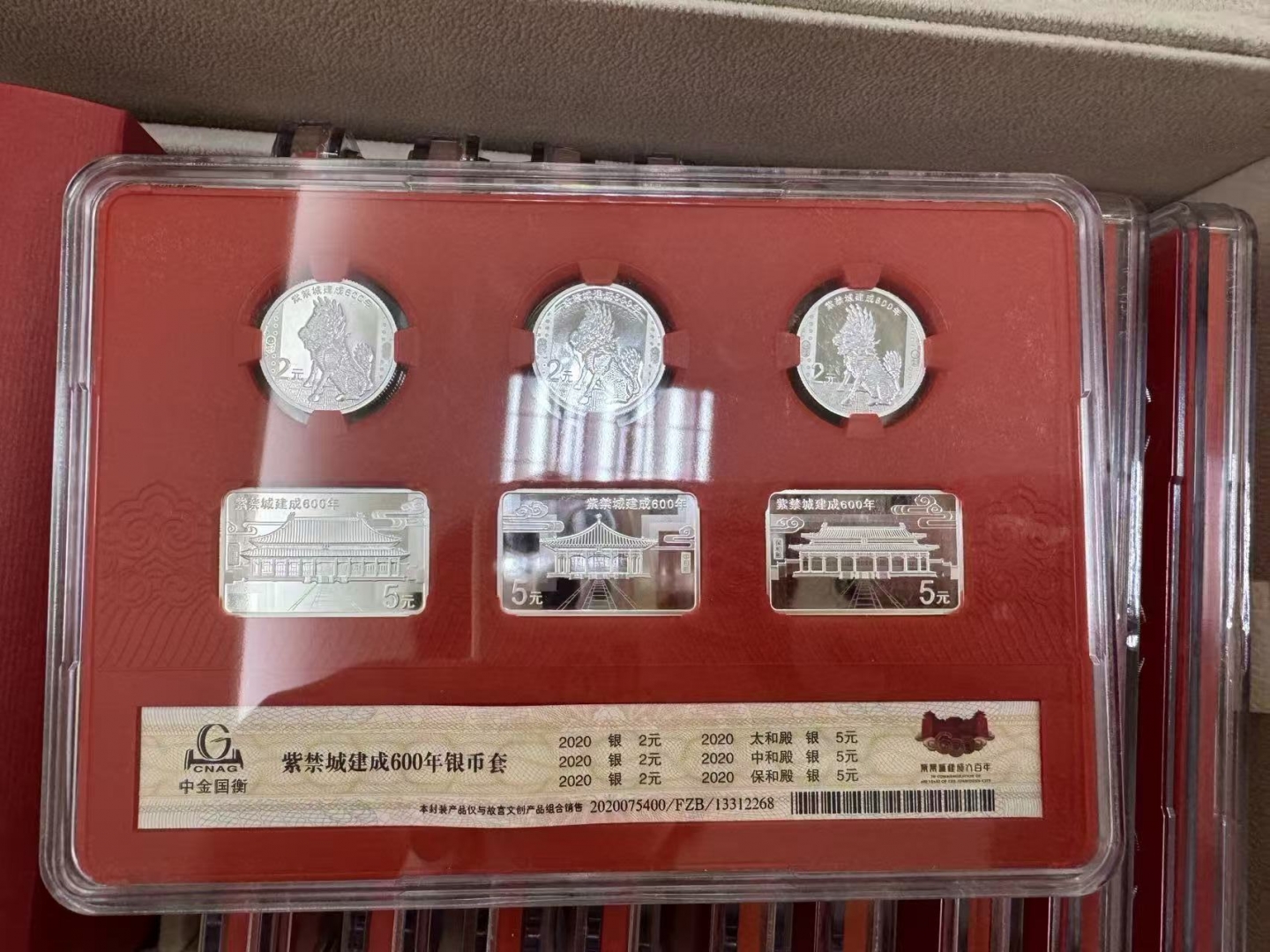• 商品描述:《紫禁和美套装》封装纪念版采用封装纪念形式,包含2020年中国人民银行发行的紫禁城建成600年5克圆形银质纪念币3枚*50(连号),纪念币背面主图为麒麟;紫禁城建成600年15克长方形银质纪念币3枚*50(连号),纪念币背面主图分别为太和殿、中和殿、保和殿;将纪念币藏于中和殿之中,同贺紫禁城600年,传递紫禁祥瑞。